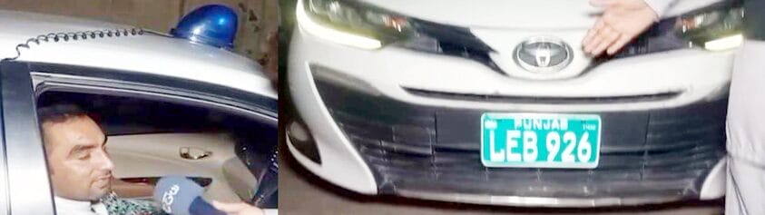 ملتان:سرکاری نمبرپلیٹ اورنیلی بتی لگی گاڑی،دوسری جانب کارمیں بیٹھاشخص نظرآرہاہے۔