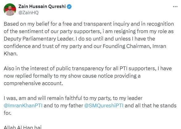 زین قریشی مستعفی ، شوکاز کا جواب بھی پارٹی کو بھجوا دیا