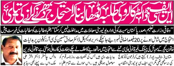 ملتان(سٹاف رپورٹر)روزنامہ ’’ قوم ‘‘ میں این ایف سی یونیورسٹی کے غیر قانونی اور ناجائزوائس چانسلر ڈاکٹر اختر علی ملک کالرو کہ جس کی پی ایچ ڈی کی ڈگری کا ریکارڈ نہ تو زکریا یونیورسٹی کے پاس ہے اور نہ ہی دیگر متعلقہ محکموں اور اداروں کے پاس ہے حالانکہ ڈاکٹر اختر علی کالرو زکریا یونیورسٹی ہی کے ملازم رہے ہیں اور قائد کے مطابق یونیورسٹی کے پاس ان کی تعلیمی استعداد کا ریکارڈ موجود ہونا ضروری ہے۔ روزنامہ ’’ قوم‘‘کی خبر جو کہ 30 مارچ کو شائع ہوئی کہ غیر قانونی اور ناجائز قابض وائس چانسلر نے طلبہ و طالبات کو ڈھال بنا کر وفاقی وزارت تعلیم کے خلاف احتجاجی تحریک چلانے کی منصوبہ بندی کرلی ہے تاکہ وفاقی وزارت تعلیم کو بلیک میل کر کے اپنی زندگی کی آخری سانس تک وہ وائس چانسلر کی سیٹ پر براجمان رہ سکیں۔یونیورسٹی کے واٹس ایپ گروپ کے ذریعے تمام CRیعنی طلبہ کا نمائندہ طالب علم اور GR اپنی طالبات کی نمائندہ طالبہ کی میٹنگ وائس چانسلر نے 2 اپریل کو اپنے دفتر میں طلب کی ہے تاکہ احتجاجی تحریک کو مرحلہ وار شروع کیا جا سکے اور پھر لاہور ملتان روڈ کو بلاک کیا جا سکے۔کوئی شخص اپنی ذات کیلئے اس حد تک جاسکتا ہے تعلیمی دنیا میں اس سے قبل ایسی مثال نہیں ملتی۔