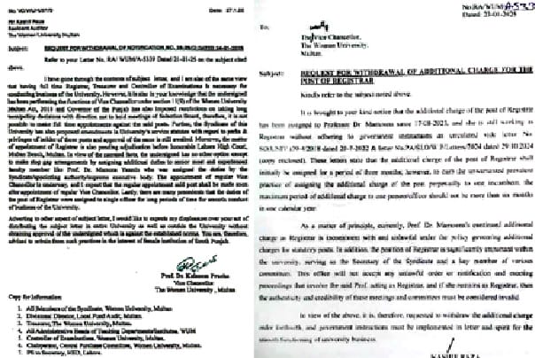 ملتان (سٹاف رپورٹر) خواتین یونیورسٹی ملتان کی پروفیسر ڈاکٹر میمونہ خان جو کہ گزشتہ 18 ماہ سے ایڈیشنل چارج پر رجسٹرار کی آسامی پر تعینات ہیں، سے رجسٹرار کا اضافی چارج واپس لینے کی بابت وائس چانسلر خواتین یونیورسٹی ملتان کو اسی یونیورسٹی کے ریذیڈنٹ آڈیٹر