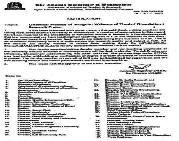 ملتان (سٹاف رپورٹر) سرکاری جامعات میں گھوسٹ و با معاوضہ تحقیقی مقالہ جات اور انٹرنیشنل جنرلز کیلئے انویسٹر کی خدمات کے بعد اسلامیہ یونیورسٹی بہاولپور نے مقالہ جات / تحقیقی پروجیکٹ کی پوشیدہ تحریر کی غیر اخلاقی مشق کے حوالے سے جاری شدہ نوٹیفکیشن کے مطابق