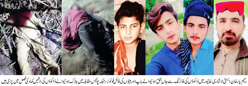 رحیم یارخان،خان پور (بیور ورپورٹ، خبرنگار)مخبری کرنے والے پولیس سہولتکارعثمان چانڈیو کے گھرپررات کے اندھیرے میں ڈاکوؤں کا حملہ ،فائرنگ کرکے تین بھائیوںسمیت4افراد کوموت کے گھاٹ اتاردیا،پولیس کی جوابی کارروائی،دو ڈاکو انجام کو پہنچ گئے۔تفصیل کے مطابق کچھ عرصہ قبل بستی لاشاری خان پور کے رہائشی
