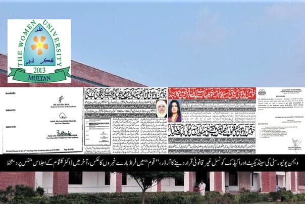 ملتان (سٹاف رپورٹر) ’’قوم‘‘ ایک مرتبہ پھر کامیاب۔ پاکستان کی تاریخ میں پہلی بار روزنامہ قوم کی نشاندہی پر خواتین یونیورسٹی ملتان کی 43 ویں سینڈیکیٹ مورخہ 3 اپریل 2025 اور 23 ویں اکیڈمک کونسل مورخہ 25 مارچ غیر قانونی قرار دے دی گئیں۔ خواتین یونیورسٹی